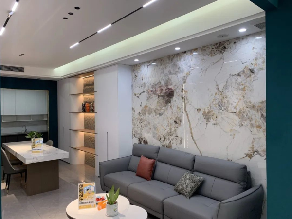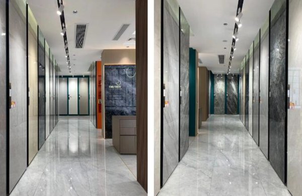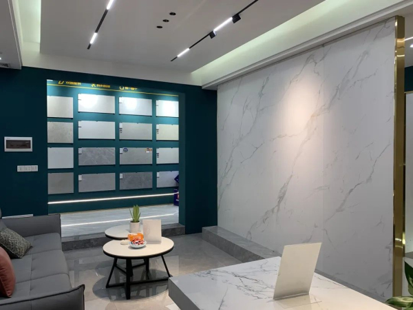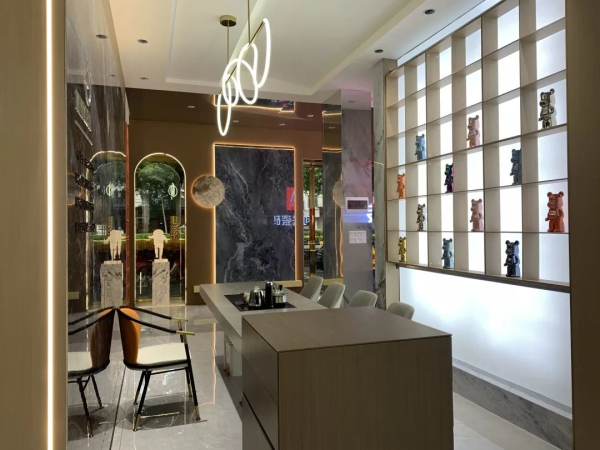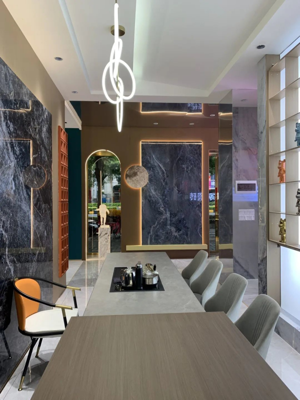韶關仁化旗艦店選材區各系列產品分區上板,整齊陳列,視野開闊,展示的產品規格多樣,品類齊全,花色新穎,特別是大板系列,搭配高端的設計,勾勒出溫馨、細致的店面風貌,令人驚艷!加上透亮燈光質感的點綴,烘托出視覺焦點。洽談區,桌椅的造型簡單大方,同時讓整個空間更加簡單時尚。