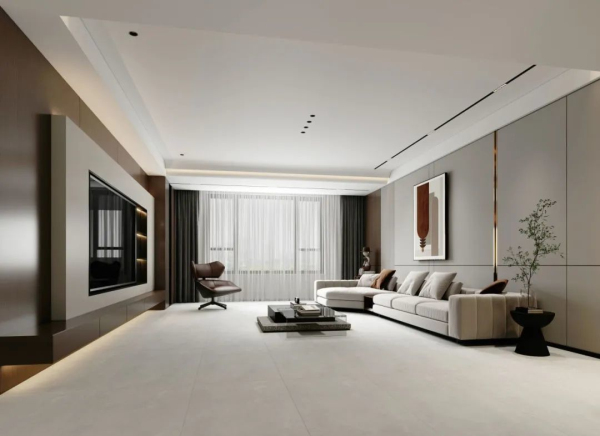 深色和淺色的沙發選擇帶給居者完全不一樣的生活體驗。整體空間沉穩之下不失幾分活潑之感,與簡潔大氣的白色電視背景墻相得益彰,形成一個層次分明、質感高級的客廳空間。