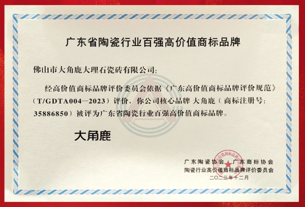 4月18日,2024年廣東省陶瓷行業(yè)年會暨廣東陶瓷協(xié)會第七屆三次會員大會在廣東(潭洲)國際會展中心隆重召開。大角鹿實力入選“2023年度廣東省陶瓷行業(yè)高價值商標品牌榜單”,并在會上獲頒“廣東省陶瓷行業(yè)百強高價值商標品牌”證書。