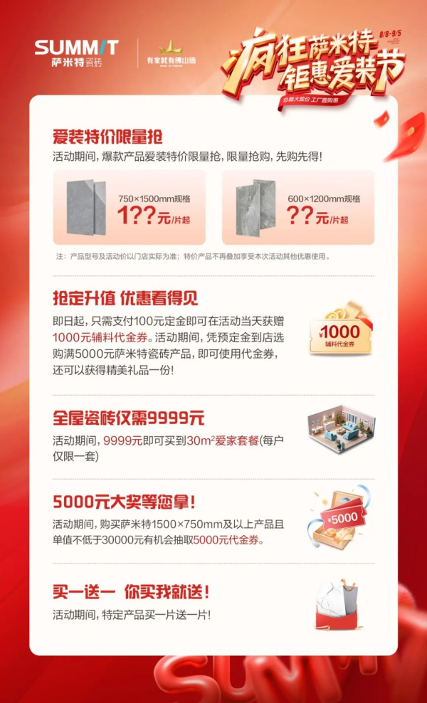 薩米特瓷磚8月鉅惠愛裝節(jié)全國(guó)聯(lián)動(dòng)活動(dòng)已火熱展開,我們對(duì)家的熱愛與追求永不止步。在未來的日子里,我們將繼續(xù)秉承“設(shè)計(jì)點(diǎn)亮生活”的理念,為消費(fèi)者帶來更多優(yōu)質(zhì)、時(shí)尚、富含自然與藝術(shù)的瓷磚產(chǎn)品。同時(shí),我們也期待在更多的節(jié)日與活動(dòng)中,與大家共同分享家的溫馨與愛的甜蜜。