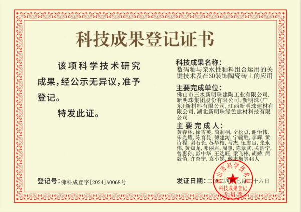近期,薩米特瓷磚“數碼釉與親水性釉料組合運用的關鍵技術及在3D裝飾陶瓷磚上的應用”喜獲由佛山市科學技術局頒發(fā)的“科技成果登記證書”。