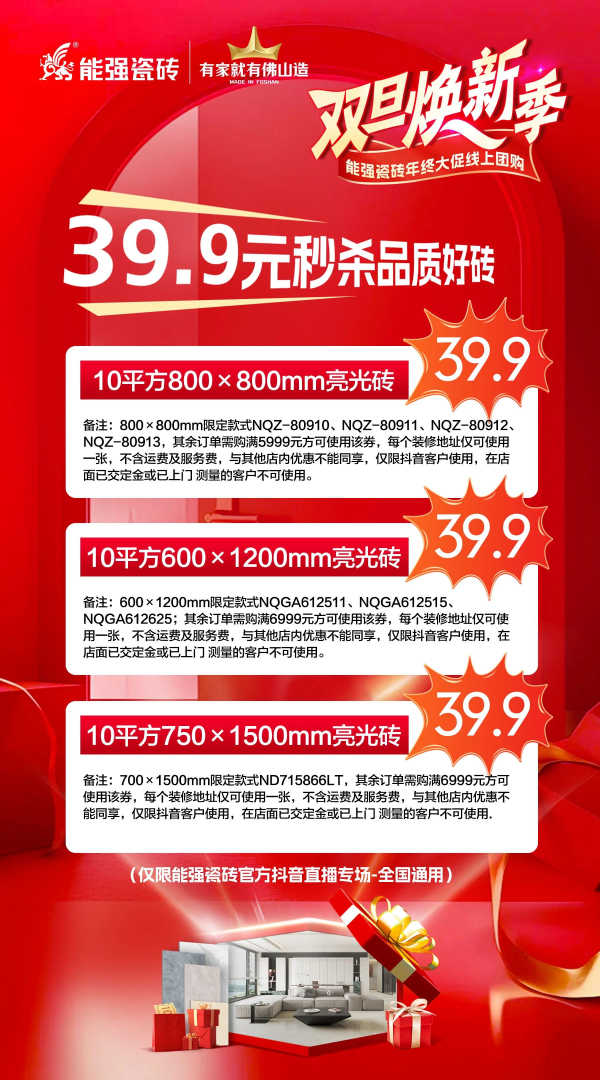 噔噔噔!錯過了能強瓷磚雙十一的你,千萬別錯過眾人期待的雙十二活動啦!年末大促,好磚就要提前搶!