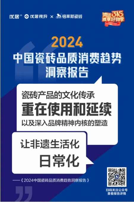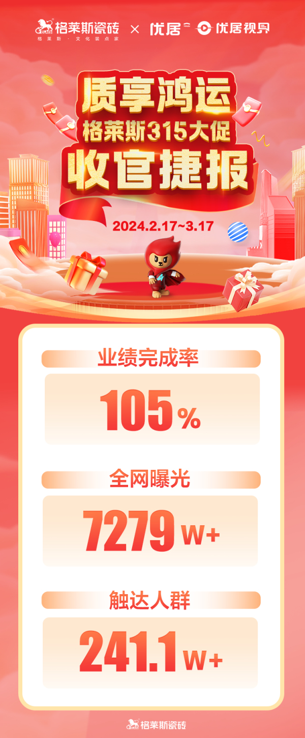 回顧2024年,格萊斯發(fā)力多維度營銷,合理利用數字技術和工具打通線上和線下渠道,提升整體市場營銷效果和用戶體驗,所取得的成績也是可圈可點。在315期間,格萊斯以“鴻運315·質享好物季”為主題發(fā)起全案營銷,聯合優(yōu)居網權威媒體發(fā)布《2024中國瓷磚品質消費趨勢洞察報告》(以下簡稱“消費趨勢報告”),結合小紅書和抖音探店,打出多渠道、全媒體的營銷組合拳,全網總曝光量達到7313w+。