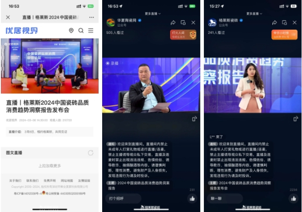 作為活動的高光點,消費趨勢報告發(fā)布會通過優(yōu)居視界網、微贊平臺、華夏陶瓷網視頻號、智造聯盟視頻號以及格萊斯瓷磚視頻號同步開播正式發(fā)布了 “2024中國瓷磚品質消費趨勢洞察報告”。剖析中國瓷磚行業(yè)的消費現狀、洞察品質消費趨勢,直播間人氣高漲,累計訪問量高達47.39w+。