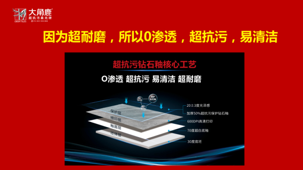 大角鹿創始人南順芝認為,大角鹿的技術創新永無止境。基于前三代超耐磨技術,大角鹿歷經五年,開創超抗污鉆石釉技術,推出第四代0滲透超抗污易清潔超耐磨柔光磚。相比市面上只抗部分污漬或表面涂蠟達到假抗污效果的“抗污磚”,大角鹿超抗污柔光磚在行業內第一個做到真正抗污。