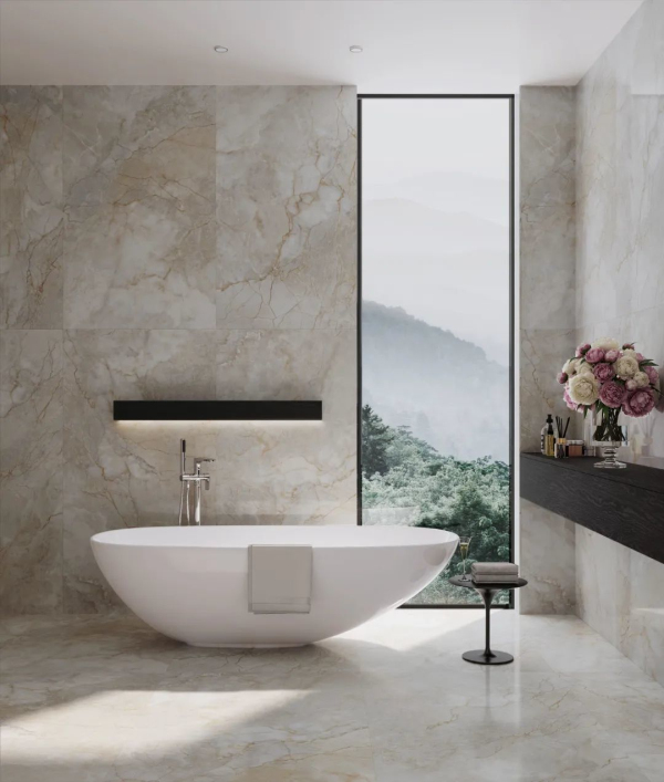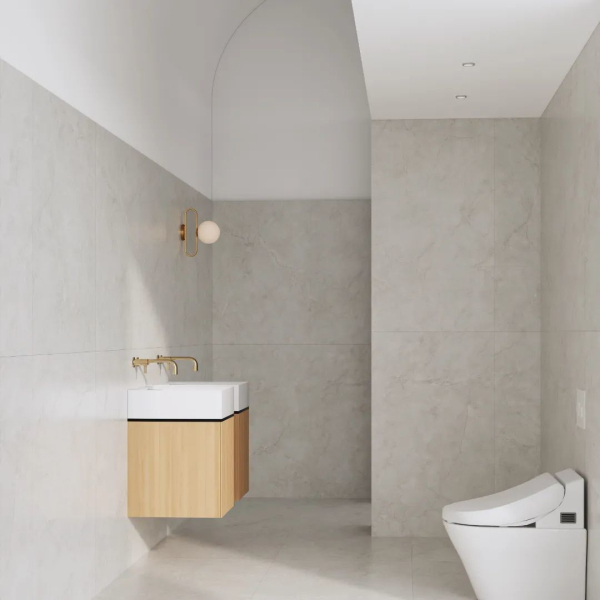 來到衛(wèi)浴空間,巴爾顏淺灰色的磚面配上自然石材紋理,賦予衛(wèi)浴空間無與倫比的自然生命氣息,窗外的陽光沿著墻面這昂哈桑而下的慵懶傾灑在地面上,盡顯衛(wèi)浴的輕柔與美感。