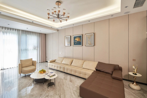 走進朱小姐家中,整個家居空間的設計采用了簡潔、干凈且線條流暢的家具和裝飾,白色皮質沙發椅與圓形大理石茶幾相得益彰,營造出明亮而舒適的氛圍。