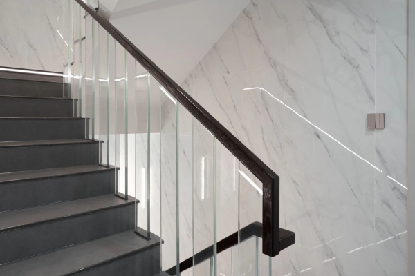 在看似不起眼的樓梯墻上,也鋪貼有深受好評的薩米特明星產品——無界之境系列·塔萊爾白。塔萊爾白瓷磚以其獨特的色彩和紋理設計,一舉成為樓梯區域的視覺焦點。這種淡雅而純凈的白色,能夠營造出清新、明亮的空間氛圍。在樓梯墻的應用中,塔萊爾白能夠提升空間的明亮度和通透感,使樓梯區域顯得更加寬敞和舒適。