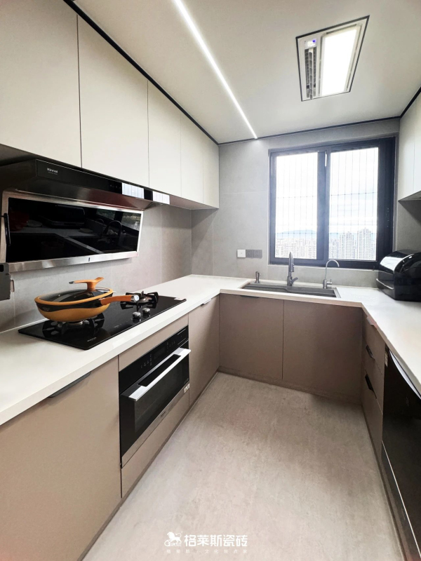 廚房采用U形島臺設計,更高效充分利用空間位置,水槽上方的窗戶讓廚房采光充足。干凈明亮的廚房讓烹飪更舒心,考慮到屋主對廚衛防污易潔的需求,墻面選用格萊斯安家系列600x1200mm的珍妮淺灰 ,素雅的色調配上超平釉工藝,油污清潔零壓力,讓烹飪時光更輕松自如。