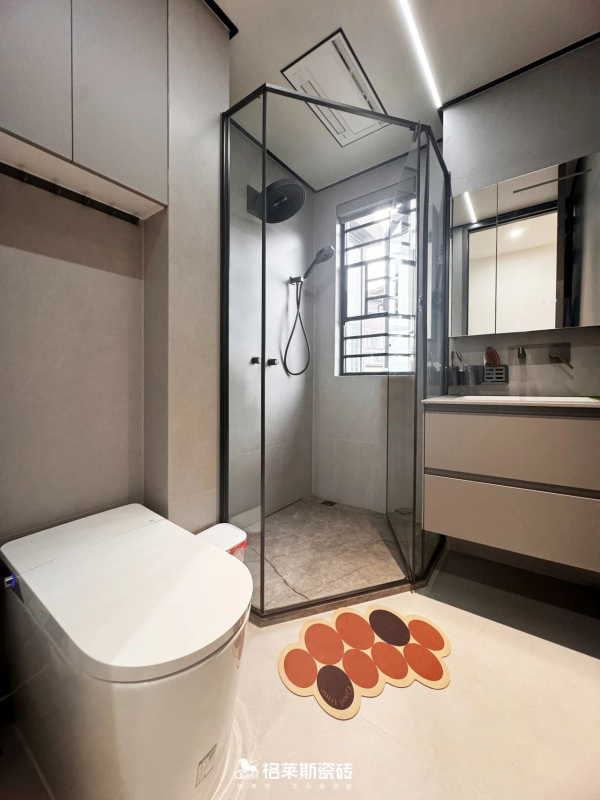 干濕區分隔的衛生間,能保持整潔的同時提高空間的使用率,磚石型淋浴間的設計巧妙運用了空間,讓鏡柜前后更多的使用空間。墻面鋪貼純凈的淺奶灰色調瓷磚,舒適的啞光視覺,給人輕松治愈的舒適感,沐浴中洗去一天的疲勞,靜靜享受治愈的時光,讓生活倍感舒展清新!
