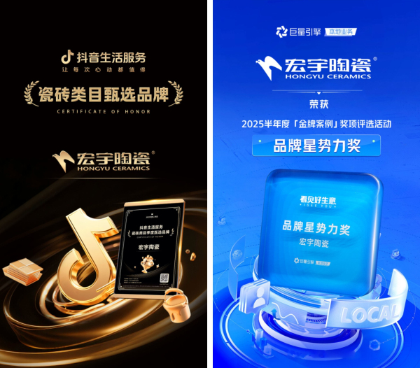 宏宇陶瓷在8月接連斬獲巨量引擎抖音官方頒發的“瓷磚類目甄選品牌”獎項、“品牌星勢力”獎項,成為行業焦點。這一成績背后,是宏宇品牌以「全域營銷」為核心的戰略升級。通過生服IP打造、內容短劇創新及直播盛典爆發的三維聯動,宏宇陶瓷實現單日成交GMV破千萬,穩居抖音團購直播留資榜TOP。這一表現印證了其從傳統銷售向數字化營銷轉型的成功。