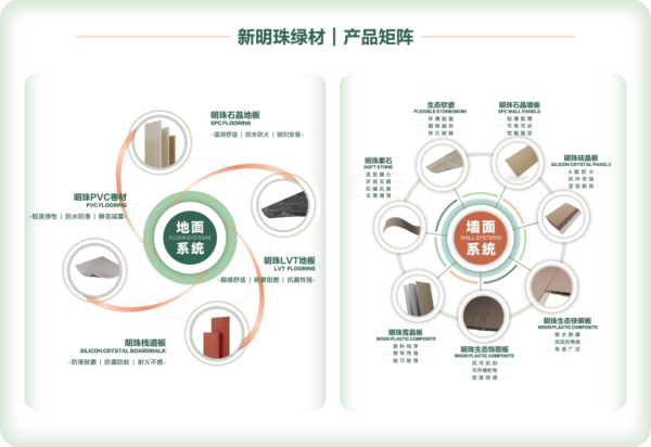 致力于成為“建筑表面裝飾系統(tǒng)化解決方案提供商”的新明珠集團(tuán),瞄準(zhǔn)了綠色新材賽道,成立新明珠綠材,通過地面系統(tǒng)(石晶地板、LVT地板、PVC卷材、明珠棧道板)與墻面系統(tǒng)(生態(tài)軟瓷、明珠柔石、石晶墻板、硅晶板、明珠雪晶板、生態(tài)飾面板、生態(tài)快裝板)的組合拳,構(gòu)建了一個(gè)系統(tǒng)的綠材產(chǎn)品矩陣,讓業(yè)內(nèi)對(duì)于綠色新材的印象逐漸清晰起來。
