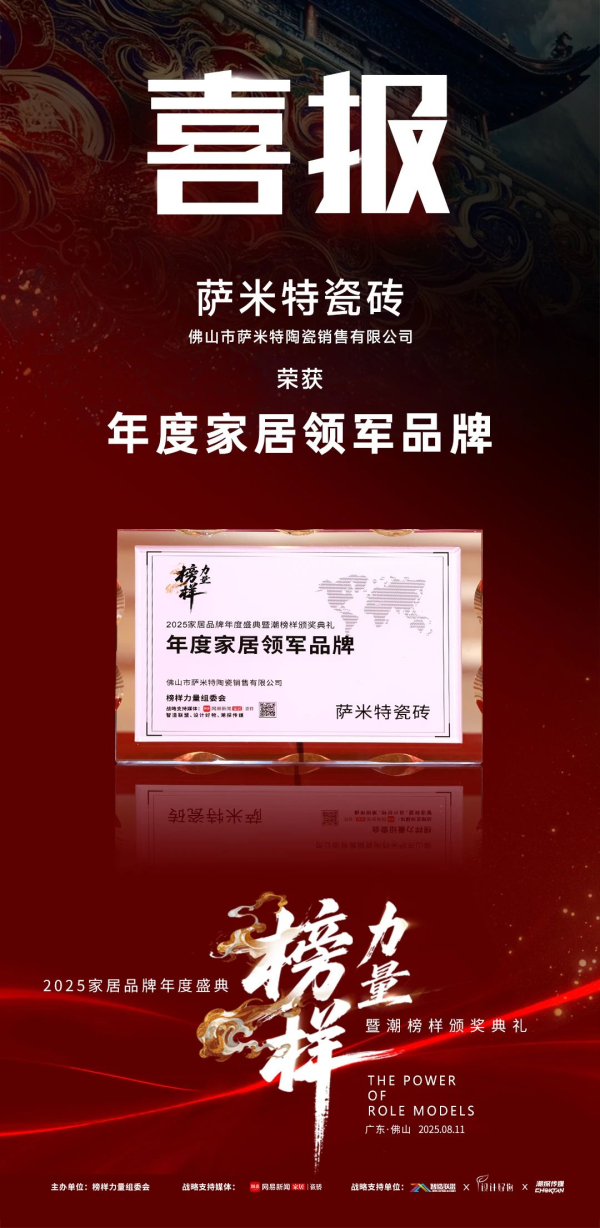 8月11日,由網易家居、智造聯盟、設計好物、潮探傳媒聯合主辦的2025榜樣力量-家居品牌年度盛典暨潮榜樣頒獎典禮在佛山隆重舉行。薩米特瓷磚實力斬獲《榜樣力量》“年度家居領軍品牌”。