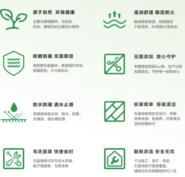 產品性能優越,實用性強。對比傳統地板遇水膨脹變形打滑,容易腐蝕蟲蛀等不足之處,石晶地板具備“防水防潮防霉、遇水更防滑、耐磨抗撞、穩定防火”等優點,可長期用于浴室、地下室等潮濕環境,在南方梅雨季節或沿海高濕度地區,仍能保持穩定不變形,成為現代建筑裝飾的優選材料。