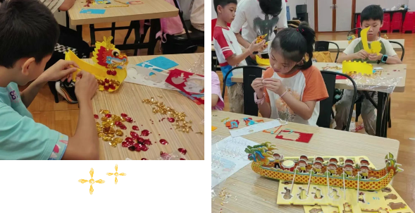 在老師的引導下,孩子們化身“小小龍舟匠”,用彩紙和木片搭建起屬于自己的龍舟。