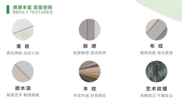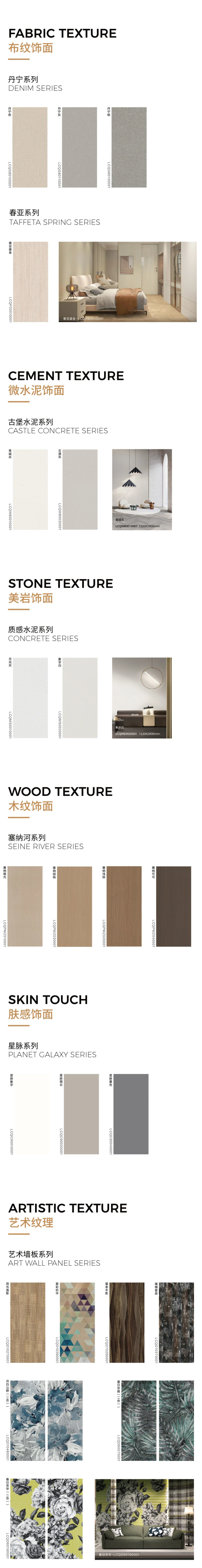 石晶墻面系統有“丹寧系列、星脈系列、質感水泥系列、古堡水泥系列、塞納河系列、春亞系列、藝術花片系列”7大系列,紋理花色及質感豐富,全面滿足設計需求。