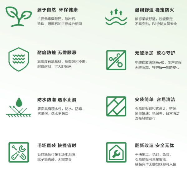 石晶墻板綠色環保、性能優越,具備“防水防潮防霉、耐磨耐刮抗沖擊、穩定防火”等優點,加上安裝便捷的優勢,可長期用于浴室、地下室等潮濕環境,適配于家居、商業體、學校、醫院等領域空間。