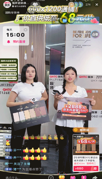 直播開啟,強輝總部與8城門店的直播間瞬間涌入數萬觀眾,互動區持續刷屏,8135晶炫系列神秘折扣劵、強輝木紋系列新品引起熱烈關注,廠商聯動直播流量創下新高!