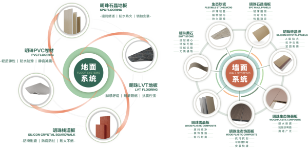 新明珠綠材緊跟新明珠集團“建筑表面裝飾系統(tǒng)化解決方案提供商”的戰(zhàn)略目標(biāo),構(gòu)建完善的綠色環(huán)保產(chǎn)品體系,全面覆蓋墻面與地面裝飾系統(tǒng)。