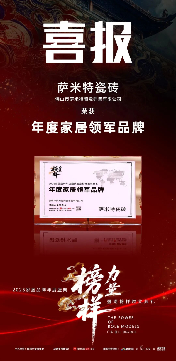 本次頒獎活動中,薩米特瓷磚實力斬獲《榜樣力量》“年度家居領軍品牌”。