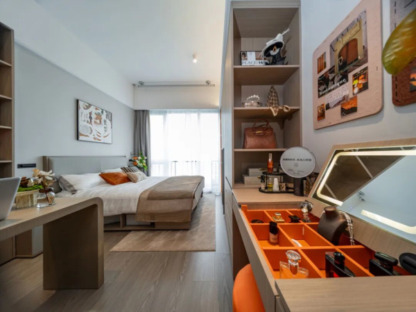 高飽和度的 “愛馬仕橙 + 普拉達(dá)綠” 打破了公寓 “千篇一律白墻” 的刻板印象,既打造出有記憶點(diǎn)的視覺標(biāo)識,又通過色彩心理學(xué)傳遞活力與優(yōu)雅,滿足女性對 “居住美學(xué)有表達(dá)” 的需求;梳妝臺不再是單一家具,而是升級為 “梳妝鏡 + 分層收納格” 的功能模塊,解決美妝用品雜亂問題;傳統(tǒng)沙發(fā)被直播桌替代,為女主播、線上學(xué)習(xí)者提供專業(yè)空間;創(chuàng)新的 “L 型收納柜” 則直擊女性 “衣物多、收納難” 的痛點(diǎn),讓空間利用更高效;樓層公共區(qū)域溫馨化布置等設(shè)計(jì),進(jìn)一步強(qiáng)化了女性租客的居住幸福感。