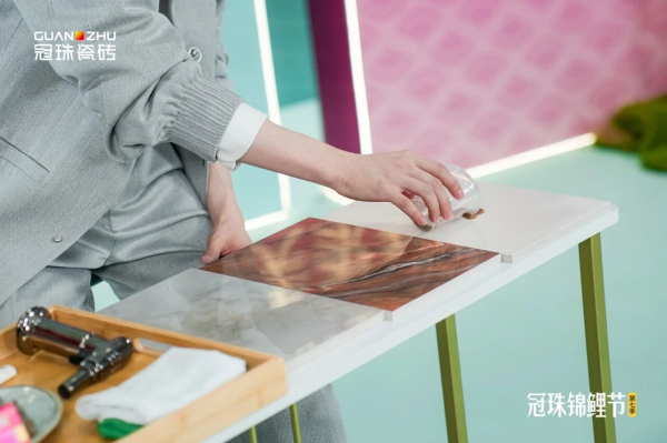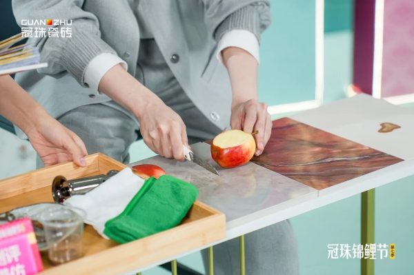 ▲冠珠臻石密境系列霞明玉映防刮測(cè)試:無懼切水果的應(yīng)用挑戰(zhàn),磚面始終光滑無痕。