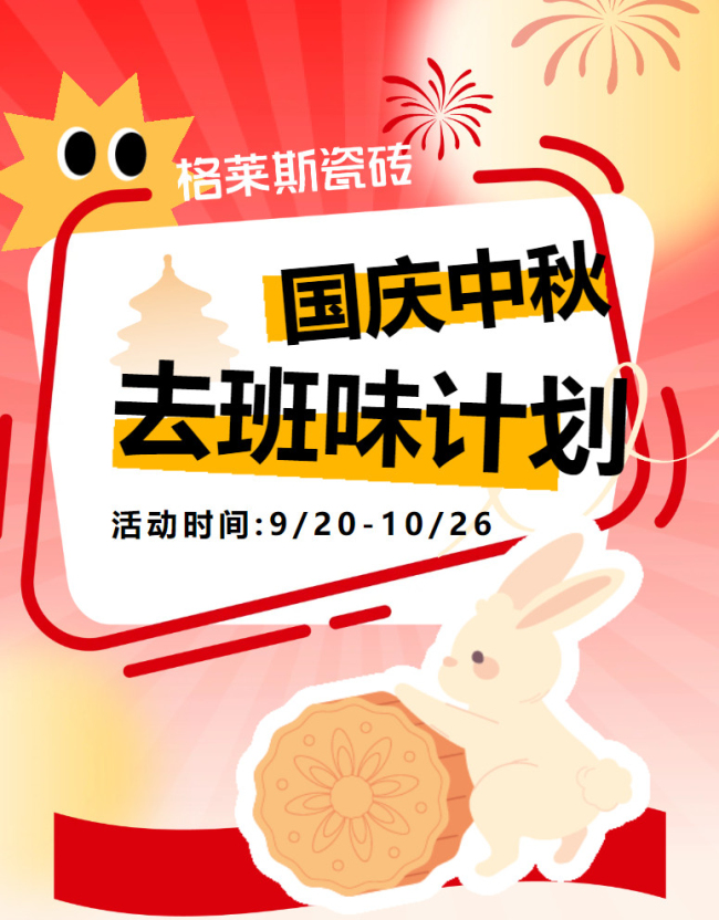 工位上缺的氧 在生活里補(bǔ)回來 國慶中秋將至 精神狀態(tài)很OK 格萊斯瓷磚 “去班味 雙節(jié)福氣購”大促 為你送上一大波班味消消好禮 開啟水靈靈的假期 跟WORK說拜拜!!! 對HOLIDAY說嗨~~~