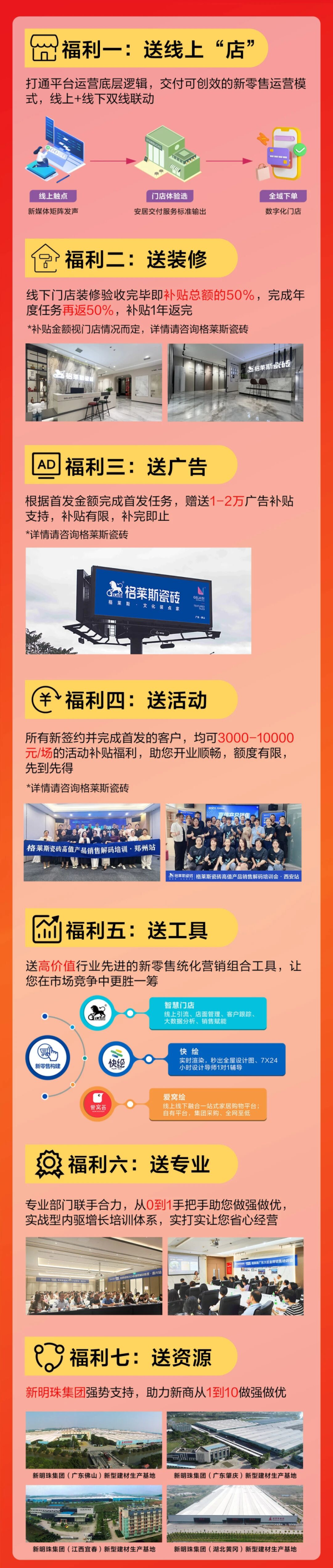 格萊斯瓷磚本次的招商計劃聚焦新媒體渠道,利用“抖音、視頻號、騰訊搜索”三大引擎聯(lián)動,充分發(fā)揮互聯(lián)網(wǎng)優(yōu)勢,精準(zhǔn)觸及更多潛在客戶。同時,品牌更推出創(chuàng)富7連送,助力新商快速盈利,還給予專業(yè)幫扶指導(dǎo)助力新商成長。