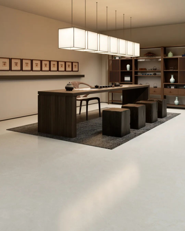 復(fù)嶂層巒一徑紓,綠筠蒼栝密還疏,凹凸有致的復(fù)刻紋理如遠(yuǎn)眺的山巒,層連疊嶂地向遠(yuǎn)方舒展。與中式簡約線條的竹節(jié)造型燈具,讓茶室禪意更濃。