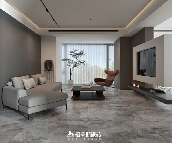 灰色大理石紋理的質(zhì)感高級,為空間奠定大氣基底,與造型簡約且具藝術(shù)感的沙發(fā)、單人椅相得益彰,材質(zhì)質(zhì)感突出。整體以灰白為主色調(diào)高級協(xié)調(diào),搭配壁爐、燈具、綠植等軟裝細(xì)節(jié),既讓空間兼具藝術(shù)感與生活氣息,又借由瓷磚與軟裝的融合,營造出雅致且富有層次的現(xiàn)代家居氛圍。