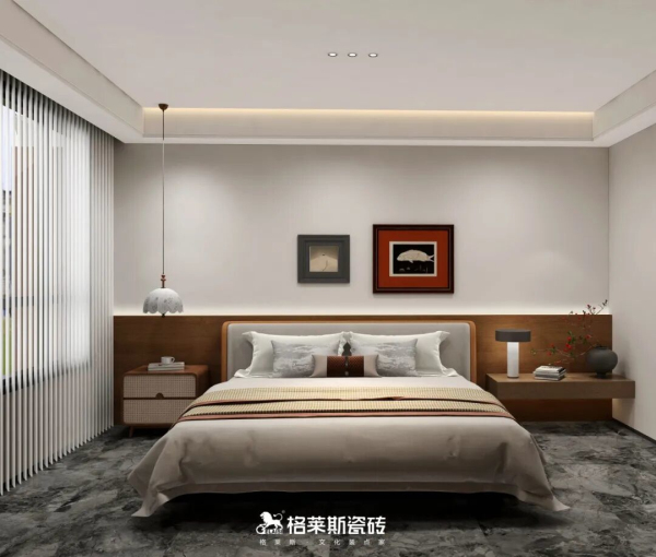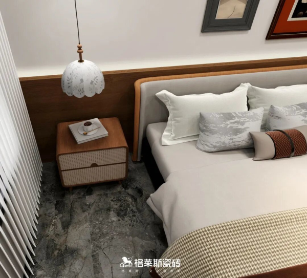 臥室使用搭配木質(zhì)家居,紅棕掛畫作為點(diǎn)綴,濃厚的復(fù)古意蘊(yùn)讓人溫暖舒心。瓷磚獨(dú)特的干粒釉配方與立體柔拋技術(shù),既保留了自然原生的質(zhì)感與堅韌,更賦予了空間如絲織物般的柔美。