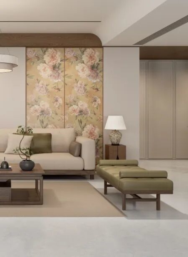 溫馨的暖杏墻面點(diǎn)綴鋪貼寓意吉祥富貴的洛神·花田花片,東方花藝散發(fā)出高雅氣息,簡單提升空間氣韻。搭配禪意燈具、綠植和國風(fēng)擺件,一個寧靜而富有禪意的當(dāng)代東方空間便油然而生。