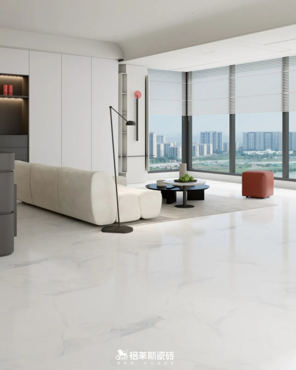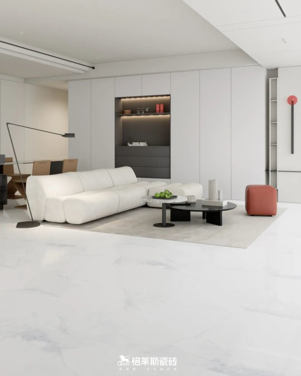 素白色系大理石紋理瓷磚質(zhì)感通透、紋理大氣,光澤15~25度之間柔和護(hù)眼,讓視覺達(dá)到舒適平衡。以高調(diào)的硬裝質(zhì)感成為空間視覺焦點(diǎn);背景墻采用大面積白色柜體與深色板材拼接,在材質(zhì)與造型設(shè)計上盡顯硬裝的極簡張力。
