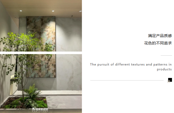 產品展示區以直板、斜板單片或組合方式,其中較亮眼的是900x1800mm以橫向三片產品組合展現,突出產品紋理的流暢銜接及紋理花色的大視覺。