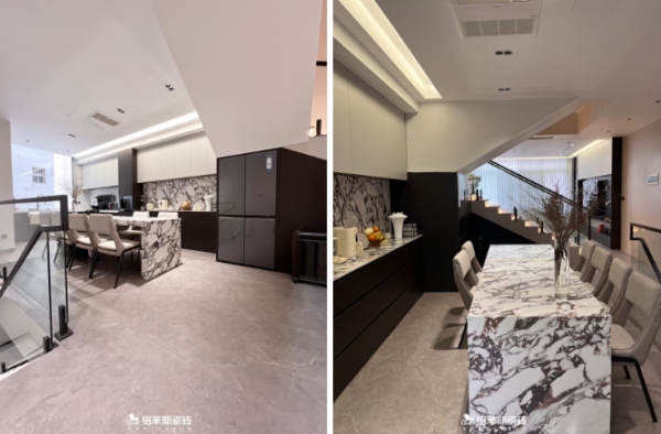 總部展廳煥新布局,圍繞750x1500mm、900x1800mm兩大規格展開,融合糖果釉,新大理石,珍珠釉、結晶釉等多種工藝,精準對應多元風格需求,涵蓋新中式、輕奢、現代簡約、混搭風等。不僅呈現高端瓷磚的品質表現,更提供從材質選擇、搭配方案到空間靈感的一體化服務,滿足消費者對產品質感花色的不同追求。