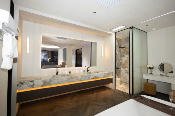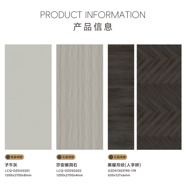項(xiàng)目主材:石晶地板(黑曜月紋-人字拼)、石晶墻板(莎安娜洞石)、雪晶墻板(子午灰)