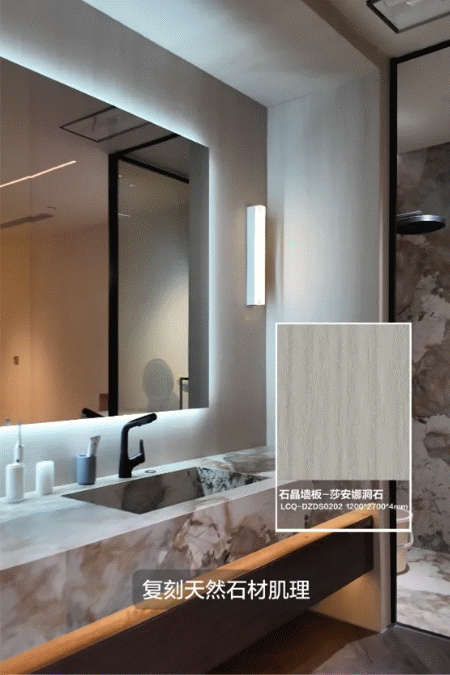 石晶墻板“莎安娜洞石”復(fù)刻天然石材的細(xì)膩紋理與質(zhì)感,防水防潮防霉、抗撞易潔的性能,在營(yíng)造沉穩(wěn)大氣空間氛圍的同時(shí),確保持久耐用。