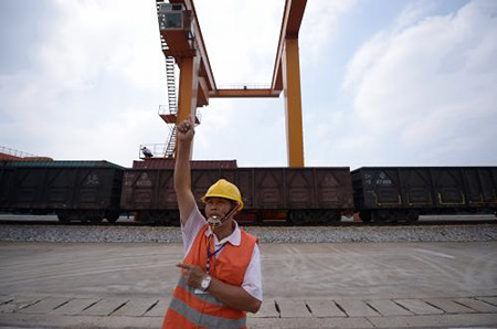 6月13日,在江西高安市八景鎮(zhèn)貨運(yùn)站,工作人員正在指揮吊車(chē)吊運(yùn)集裝箱。6月15日起,鐵路部門(mén)將開(kāi)始全面推行貨運(yùn)組織改革,許多制造業(yè)將從中獲益并降低成本。以陶瓷制造基地江西高安為例,推行貨運(yùn)組織改革后,貨主從提出需求到安排貨物出發(fā)的時(shí)間預(yù)計(jì)將縮短3天;而以往需要填寫(xiě)10多張表格,繳納各種費(fèi)用,試行貨運(yùn)改革后將變?yōu)橹恍枰顚?xiě)一張表格繳納一項(xiàng)總費(fèi)用。據(jù)貨主介紹,物流環(huán)節(jié)時(shí)間成本和經(jīng)濟(jì)成本的降低將有效提升當(dāng)?shù)靥沾僧a(chǎn)品的競(jìng)爭(zhēng)力。