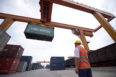 6月13日,在江西高安市八景鎮(zhèn)貨運(yùn)站,工作人員正在指揮吊車(chē)吊運(yùn)集裝箱。