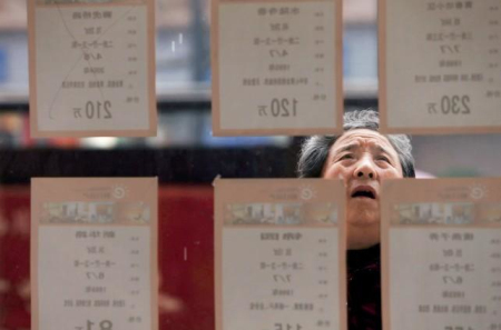 一手房“日光盤”頻現,二手房市場同樣火熱。圖為房產中介公司外,一位市民在“仰望”房價。CFP