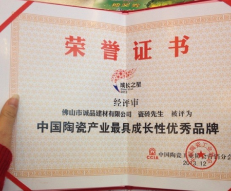2013年12月30日晚,由中國陶瓷工業協會營銷分會、《東西傳訊》雜志社主辦的2010年度成長之星(第二屆)頒獎典禮在佛山隆重舉行。瓷磚先生榮獲“2013年度成長之星•中國陶瓷產業最具成長性優秀品牌”。