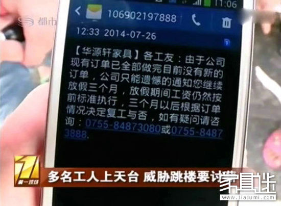 7月26日,華源軒家具的工人又收到短信,稱由于公司現有訂單已全部做完,目前沒有新的訂單,只能繼續放假3個月,放假期間工資仍然按前標準執行,3個月后根據訂單情況決定復工與否。