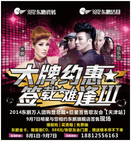 過了早春,過了盛夏,在中秋到來之前,9月7日我們率先迎來天津東鵬“大牌約惠•簽載難逢Ⅲ”萬人團(tuán)購暨總裁•巨星簽售歌友會(huì)!東鵬潔具將邀請(qǐng)剛剛斬獲中國華語唱將音樂對(duì)戰(zhàn)節(jié)目《我為歌狂》專家組“最佳男歌手”稱號(hào)的劉文杰,領(lǐng)銜信樂團(tuán)強(qiáng)勢(shì)登陸天津,與韓國性感舞后米娜同臺(tái)演出!最后三天倒計(jì)時(shí),這將會(huì)是一場(chǎng)被俊男美女環(huán)繞的視覺宴會(huì),更是一場(chǎng)充滿勁歌熱舞秋日饕餮盛宴。