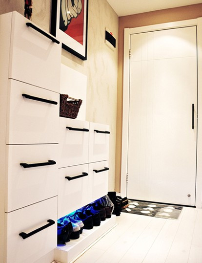 4、鞋柜必須留出一個(不低于45厘米)較高的隔層,以便于女士靴子、水靴的擺放,而且要保證足夠的深度(因為一些鞋盒有40厘米左右)。