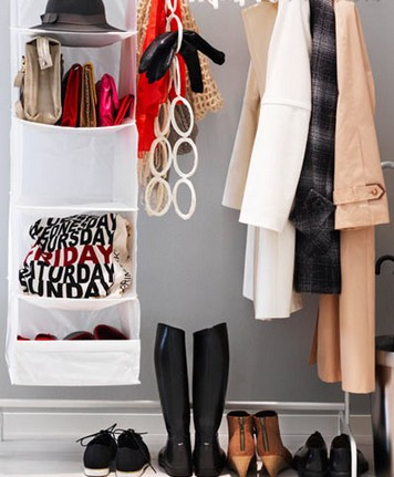 組合混搭的藝術:沒有柜門的開放式衣櫥柜,需要創意的組合才能避免單調,多層收納袋的規整,搭配收納像圍巾、領帶、皮帶等細碎物品的多孔衣架,讓收納一目了然的同時也不乏美感。