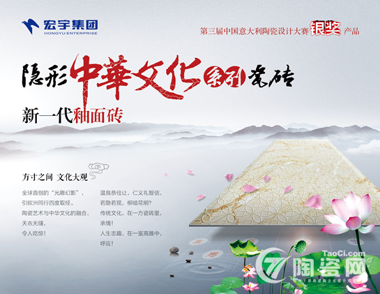 宏宇“隱形中華文化系列瓷磚”曾經在我報舉行的“中意陶瓷設計大獎賽”獲得了銀獎。我參與了評審過程,體會頗深。當時,其他評委并不知道此瓷磚有何特殊之處,我本人第一眼看到的時候,也覺得很奇怪,宏宇為何拿這么一款平凡的瓷磚來參賽?好奇之下,拿起來細細觀看,當看到采用“光雕幻影”技術生產的隱形花紋的時候,覺得非常吃驚,瓷磚與中華文化結合得真的非常好!歐總及宏宇的員工們也寫了一系列的古典詩詞,來詮釋這系列瓷磚的產品文化?梢哉f,宏宇集團把中華文化在這款磚里面做透了——里面融入了“福喜文化、財富文化、琴棋書畫文化”等,這些都是中國的傳統文化,同時也是普羅大眾廣為接受的文化。在營銷方式上,終端推廣也采用了“買文化瓷磚,送詩詞墨寶”這一頗具文化意味的營銷活動。該系列產品,從產品設計、研發、生產、到產品的策劃推廣,都做足了“文化”功夫。