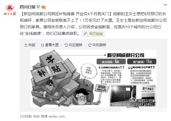 事件發生在11月30日下午,成都市民王女士稱自己9月份在新空間成都分公司預訂了的家具,當她想把預定的衣柜裝好,但家具老板卻失聯了,1萬多元打了水漂!據了解當時和她一起團購的顧客還不少,多數顧客也都出現了這樣的問題,目前眾多顧客已經組建了維權群,向相關負責人討說法。然而,目前新空間公司因資金鏈斷裂,在國內10個城市的分公司已經“全線崩潰”,公司員工已經集體辭職,成都分公司也已經空無一人。