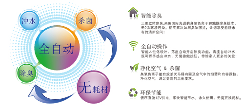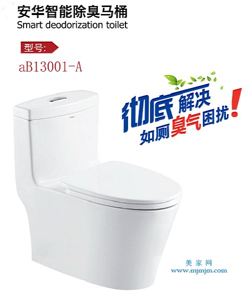 安華衛浴坐便器aB13001-A除具有普通坐便器的功能外還具有智能除臭功能。領先采用水過濾除臭、觸媒( TIO2)除臭、臭氧殺菌除臭等三重除臭程序,經過三重除臭過濾,臭味氣體被完全凈化為無色無味氣體排到馬桶水箱中,既凈化空氣又徹底解決如廁臭味困擾。