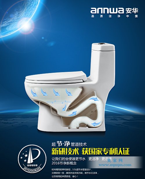 安華全系列陶瓷坐便器應用“一沖凈”、“超瞬節”潔凈核心技術,較傳統坐便器水動力提升100%沖勁十足,能夠確保水流利用率,達到一次沖凈污物。在相同沖水效果下,一家三口每天節水30升,節水效率比普調節水坐便器提升25%。其“超節凈”新研管道技術,更獲國家專利認證。