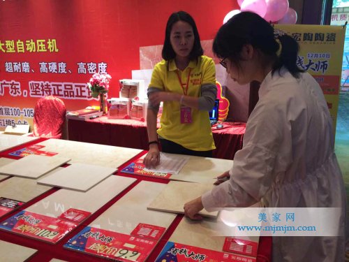 作為國家標準制定企業,宏陶陶瓷也得到了活動現場主持人的全力追捧,主持人表示:自己從事建材行業十幾年,宏陶品牌一直以優秀的口碑和產品品質著稱,是廣東陶瓷品牌耀眼的代表。一直以來,消費者都不知道如何分辨與挑選品質優秀的產品,宏陶品牌培訓主管李瑛現場教消費者挑選產品:一看二摸三比較,質量過硬的產品磚面無黑點,花紋清晰,用手摸起來質地非常細膩,磚坯比較白。
